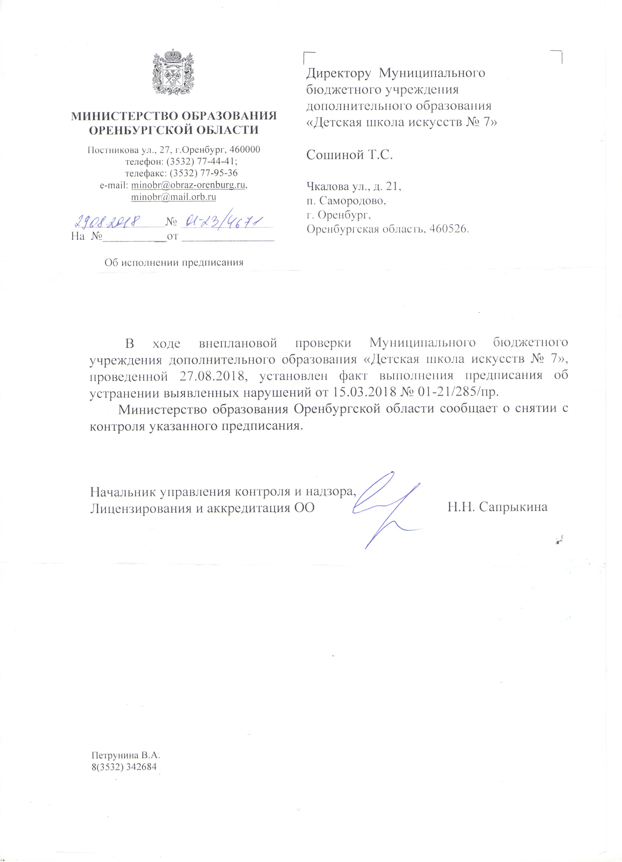 Письмо министерства образования Оренбургской области "Об исполнении предписания"