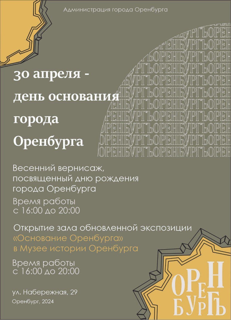 В этот же день в 16:00 в Музее истории Оренбурга на Набережной состоится открытие обновленной экспозиции «Основание Оренбурга». Анна Иоановна торжественно передаст «Привилегию» г. Оренбургу, «подарит» музею свое платье, в экспозиции появится история возникновения пуховязального промысла в казачьих семьях, история геологической разведки Оренбургской научной экспедиции и многое другое.
