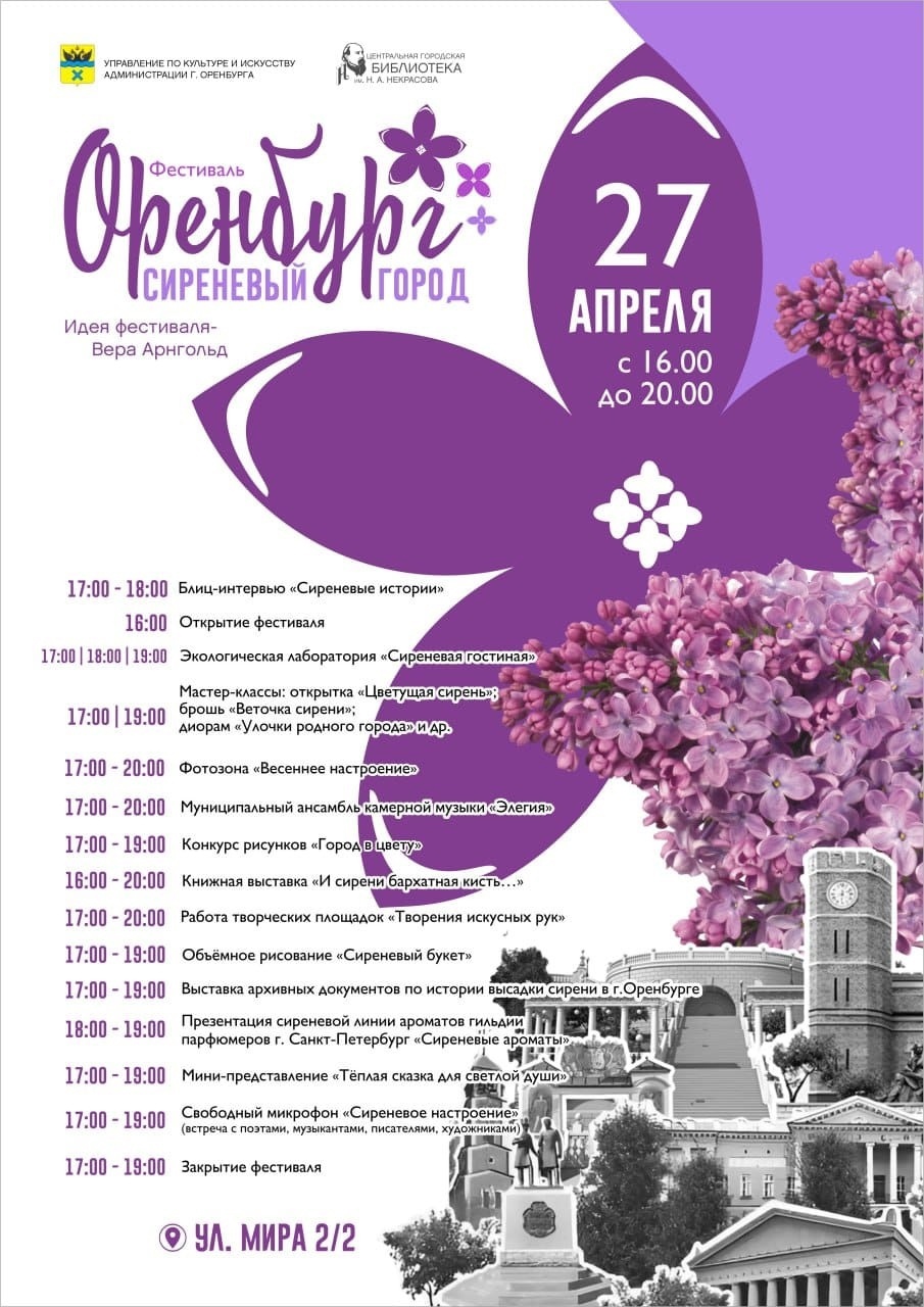 Сиреневый город.jpg27 апреля 2024 г. в Центральной городской библиотеке им. Н.А. Некрасова с 16:00 до 20:00 состоится Фестиваль "Оренбург- сиреневый город", организованный ко дню основания города.